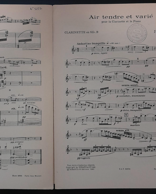 Jean Hubeau Air tendre et varié partition pour clarinette et piano