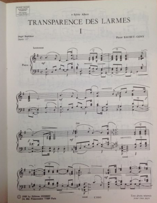 Pierre Baubet-Gony Transparence des larmes partition pour piano