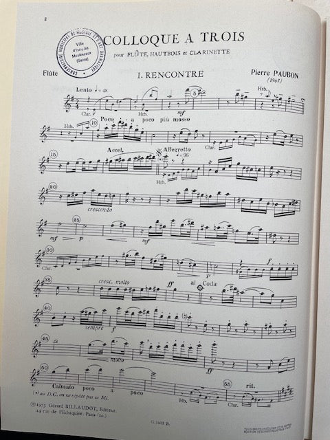 Pierre Paubon Colloque à trois - trio pour flûte, hautbois et clarinette