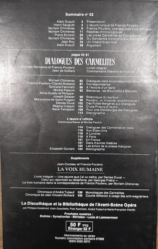Poulenc Dialogue des Carmélites Revue "Avant-scène" opéra n° 52