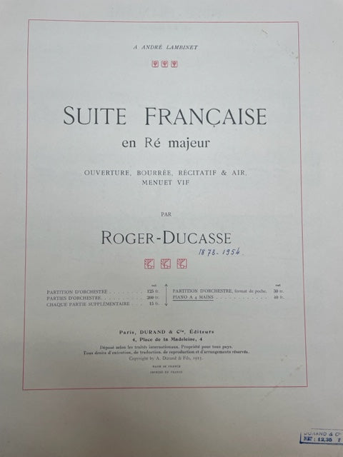 Roger Ducasse Suite française en ré majeur partition pour piano à 4 mains