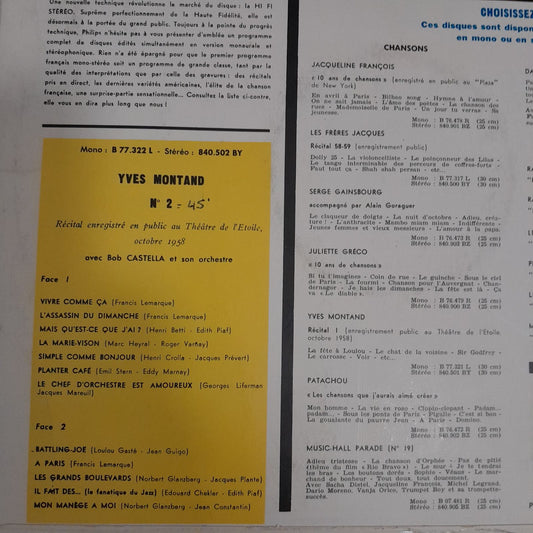 Vinyle Yves Montand Récital enregistré en public au Théâtre de l'Etoile, Octobre 1958