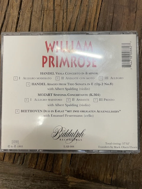 CD William Primrose Händel Concerto pour alto - Händel Adagio de la sonate en trio op.2 - Mozart Symphonie concertante - Beethoven Duo