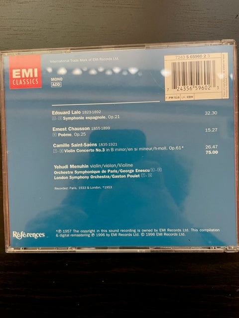 CD Yehudi Menuhin au violon Lalo Symphonie espagnole - Poème de Chausson - Saint-Saens concerto n°3 pour Violon