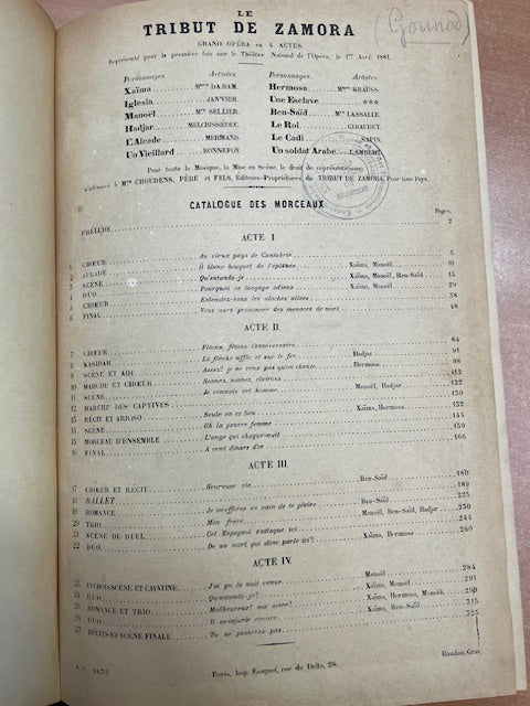 Charles Gounod Le tribut de Zamora, grand opéra en 4 actes réduction piano voix