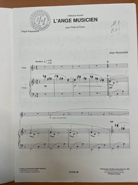 Alain Roizenblat L'ange musicien partition pour flute et piano