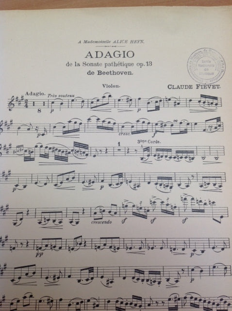 Claude Fievet Adagio de la sonate pathétique op 13 de Beethoven partition pour violon, violoncelle piano