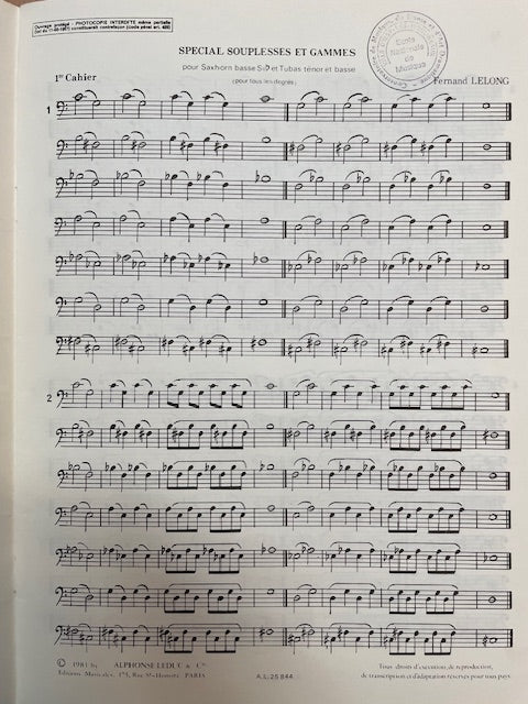 Fernand Lelong Spécial souplesses et gammes pour saxhorn basse si b ou tubas ténor ou basse 2er cahier