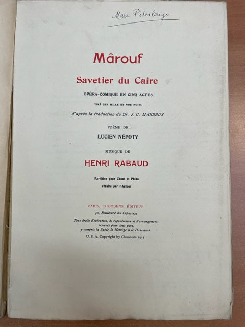 Henri Rabaud Mârouf, savetier du Caire, opéra-comique en 5 actes réduction piano chant