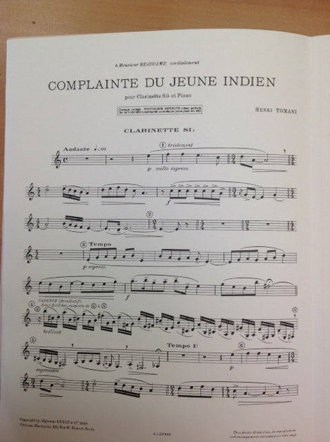 Henri Tomasi Complainte du jeune Indien partition pour clarinette et piano