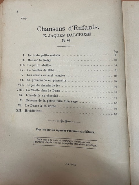 Jaques Dalcroze Chansons d'enfants op. 42 pour chant et piano