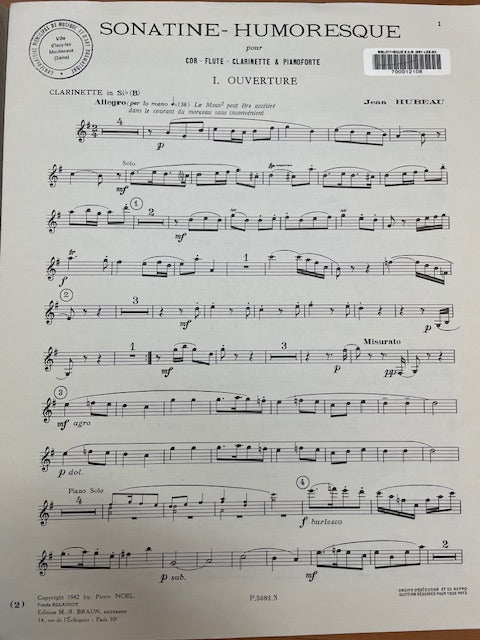 Jean Hubeau Sonatine humoresque Cor, flûte, clarinette et piano