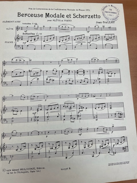 Jean Gallet Berceuse modale et scherzetto partition pour flute et piano