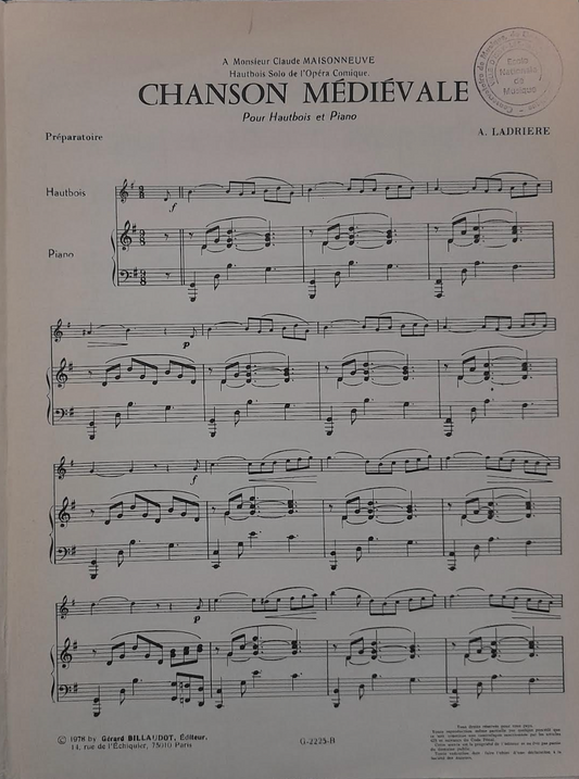 Ladrière Chanson médiévale - Niveau préparatoire partition pour hautbois et piano