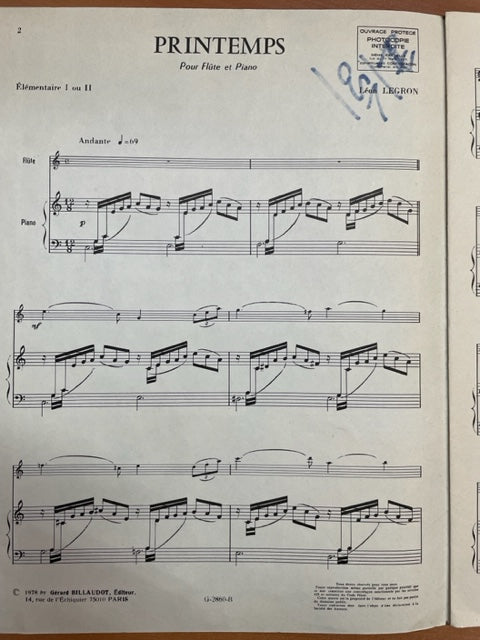 Léon Legron Printemps partition pour flute et piano