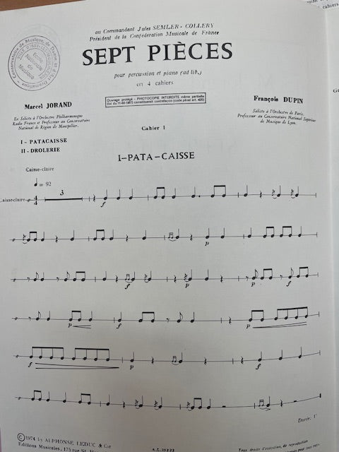 M. Jorand - F. Dupin Sept pièces pour percussion et piano en quatre cahiers volume 1
