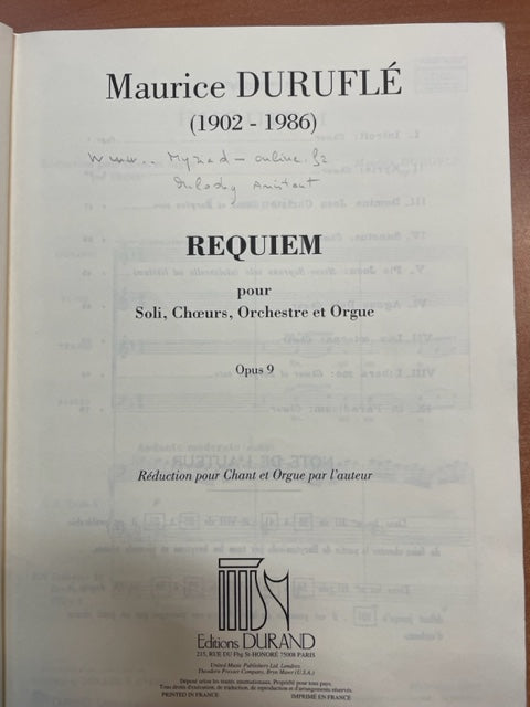Maurice Duruflé Requiem - réduction pour chant, orgue et quintette à cordes