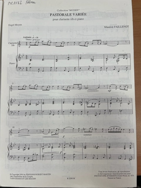 Maurice Faillenot Pastorale Variée pour clarinette sib et piano