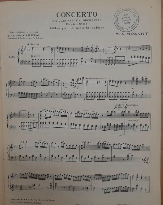 Mozart Concerto pour clarinette et orchestre K622 - réduction clarinette et piano