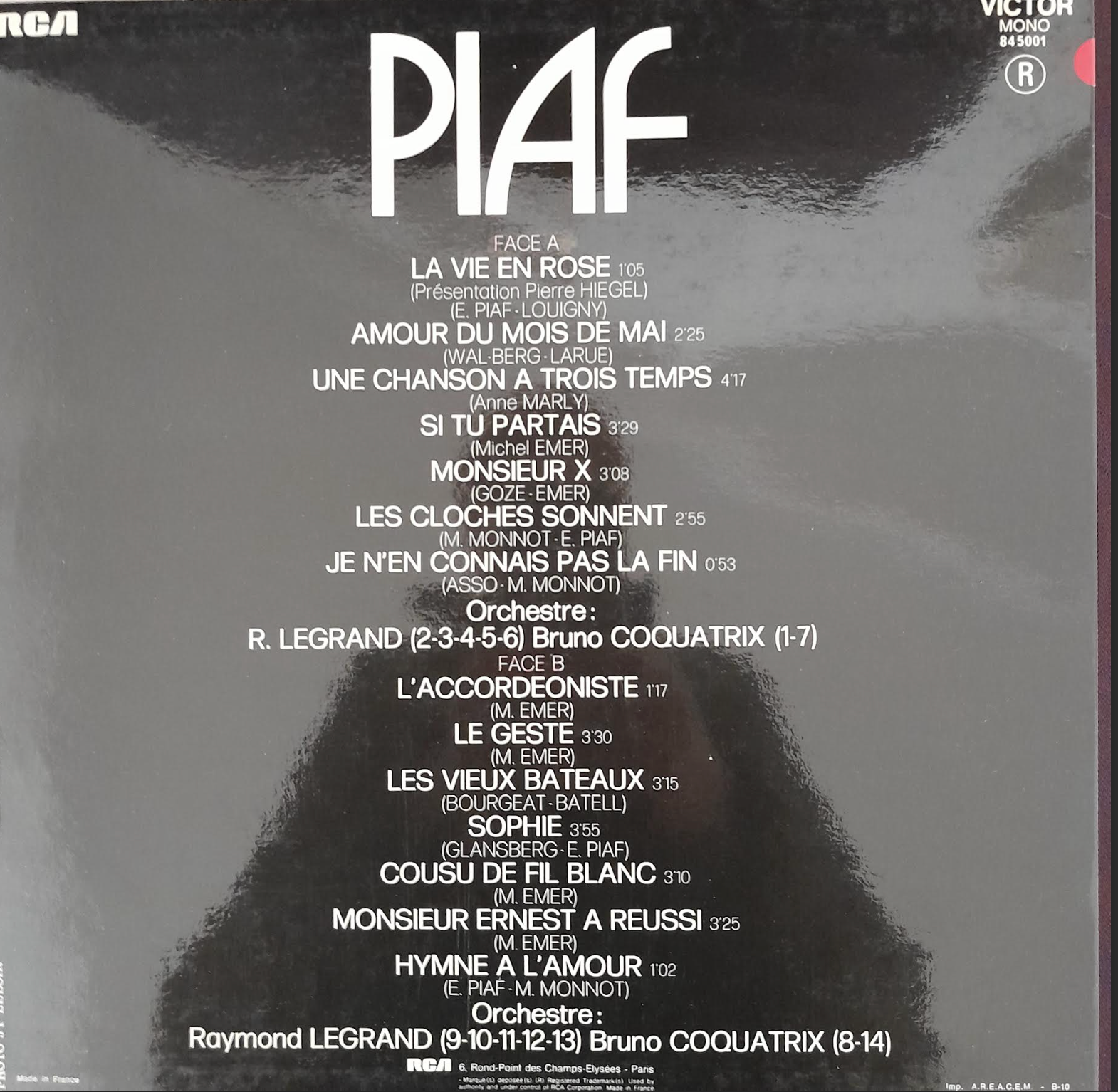 - Titres: La vie en rose - Amour du mois de mai - Une chanson à 3 temps - Si tu partais - Monsieur X - L'accordéoniste - Les vieux bateaux - Hymne à l'amour..